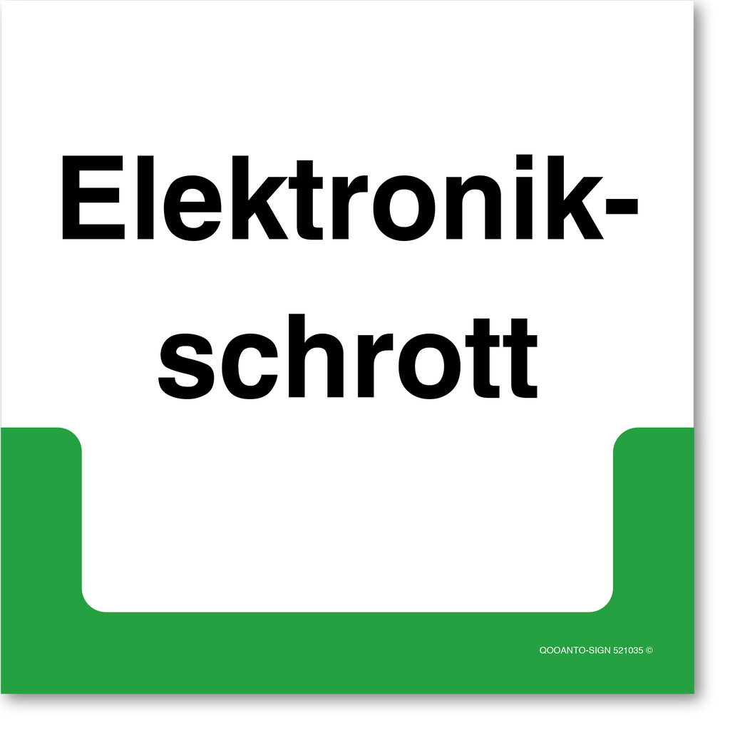 Elektronikschrott Schild oder Aufkleber, aus Alu-Verbund oder Selbstklebefolie, mit UV-Schutz, weiss/grün. Mit dem deutlich lesbaren Schriftzug Elektronikschrott markieren Sie in allen Bereichen und Anwendungen Klarheit. 100% UMWELT SCHÜTZEN!