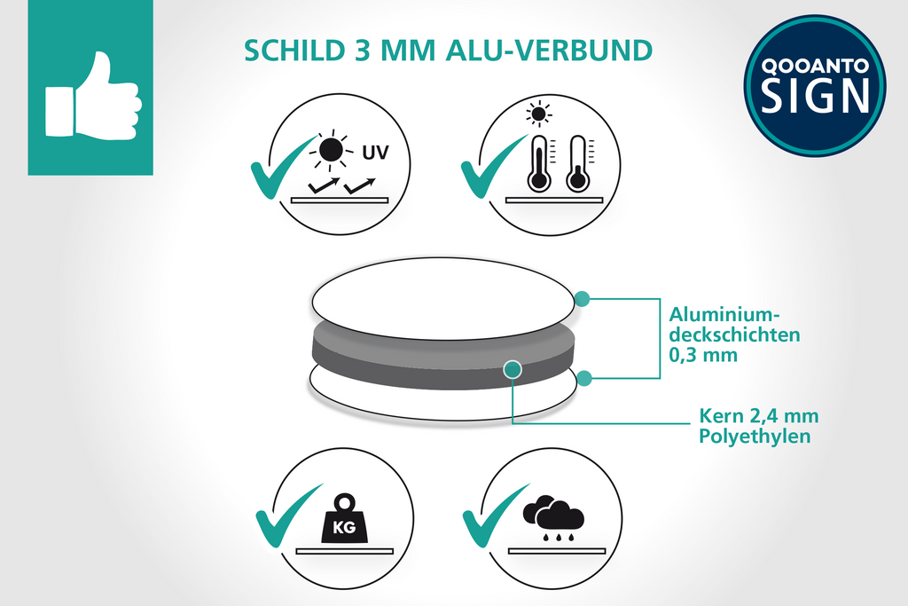 3 mm Alu-Verbundmaterial ist sehr stabil und biege steif, aber dennoch ein Leichtgewicht. Die perfekte Basis für Schilder zur Anwendung im Innen- und Aussenbereich, mit geringer Wärmeausdehnung, auch bei starken Temperaturschwankungen im Sommer und Winter.
