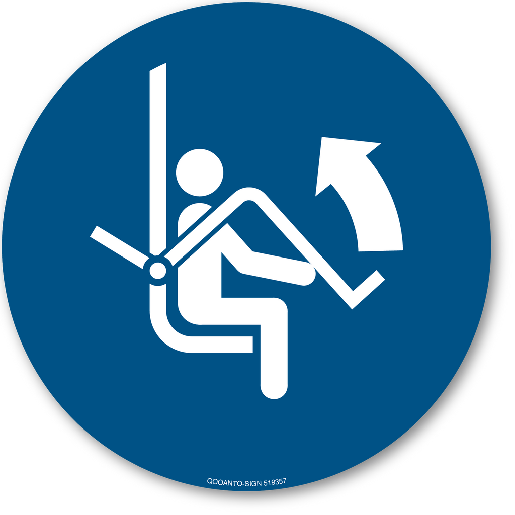 Sicherheitsbügel Des Sessellifts Öffnen, EN ISO 7010, M034 Gebotsschild oder Aufkleber | Alu-Verbund oder Selbstklebefolie | Blau/Weiss | Rund